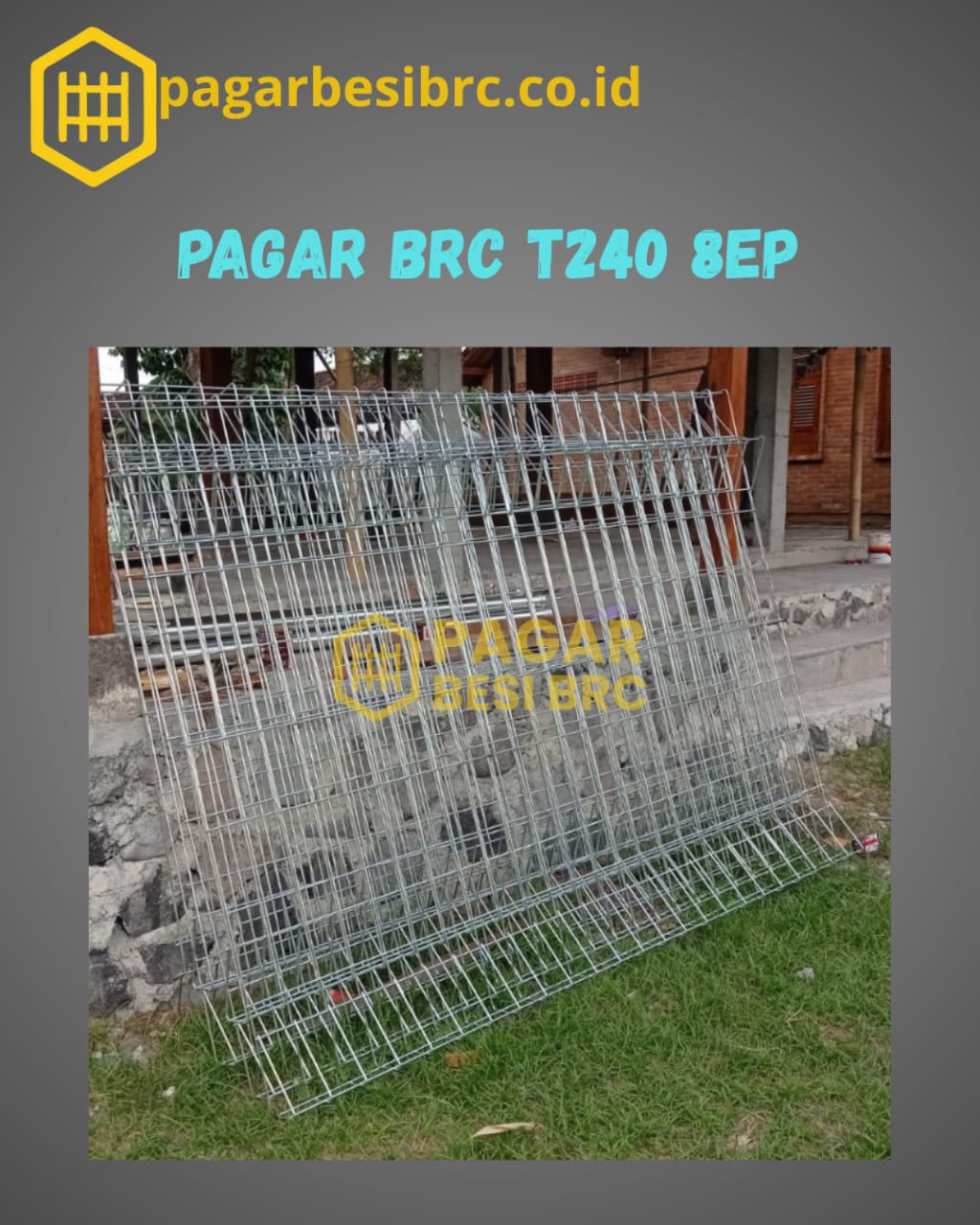 Pagar BRC (British Reinforced Concrete) ini memiliki tinggi 240 cm dengan diameter besi 8 mm merupakan pilihan terbaik untuk kebutuhan pengamanan tinggi seperti proyek skala besar, pembatas kawasan industri, bandara, fasilitas militer, atau properti dengan tingkat keamanan tinggi. Dilengkapi finishing elektroplating, yaitu proses pelapisan logam dengan menggunakan arus listrik positif dan negatif yang saling tarik-menarik dalam larutan khusus. Ion logam pelapis berpindah dan menempel merata ke permukaan pagar, sehingga menghasilkan lapisan halus, mengilap, dan tahan karat.