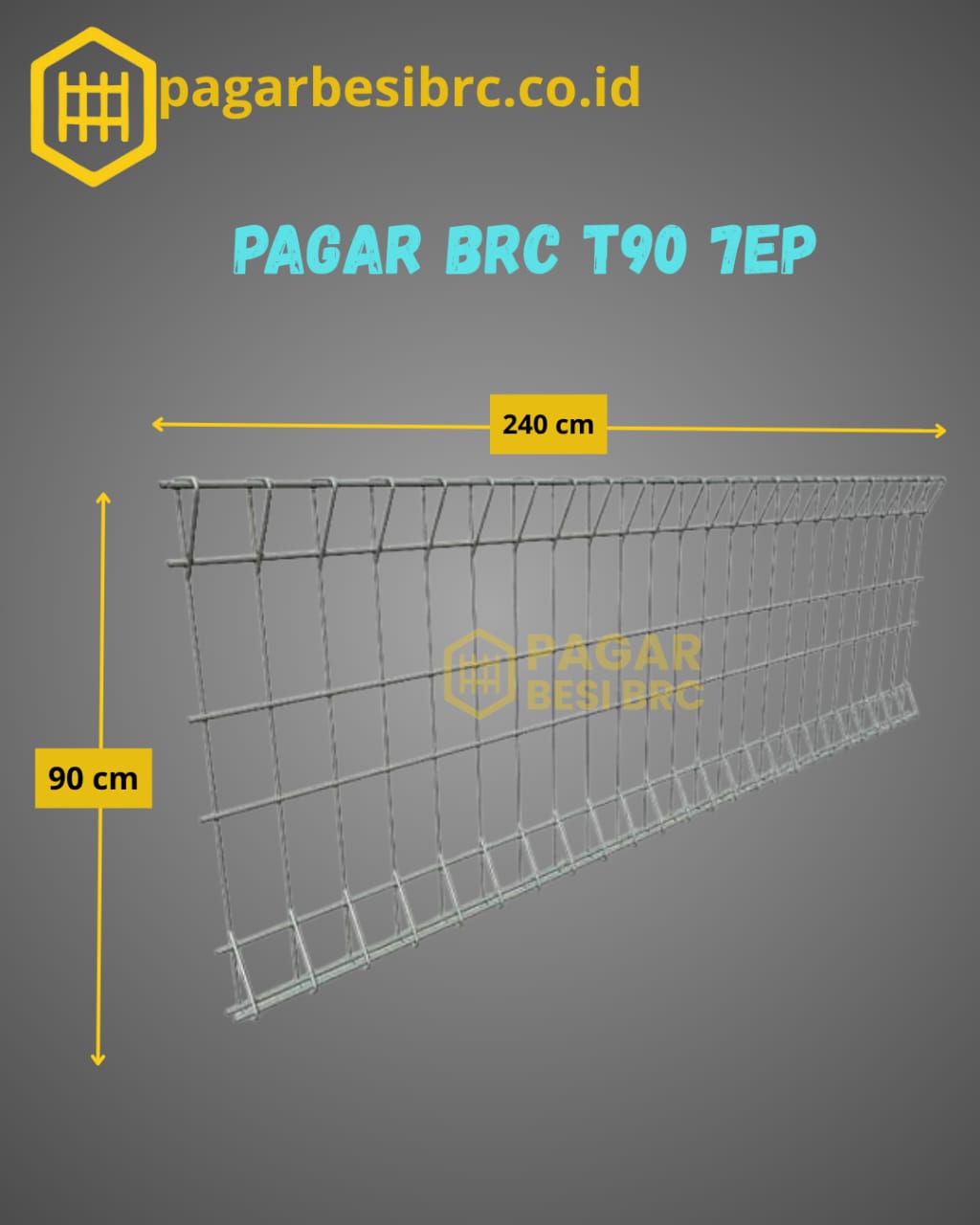 Pagar BRC (British Reinforced Concrete) ini memiliki tinggi 90 cm dengan diameter besi 7 mm, cocok digunakan untuk taman, pembatas proyek, lahan pribadi, dan fasilitas umum. Dilengkapi finishing elektroplating, yaitu proses pelapisan logam dengan menggunakan arus listrik positif dan negatif yang saling tarik-menarik dalam larutan khusus. Ion logam pelapis berpindah dan menempel merata ke permukaan pagar, sehingga menghasilkan lapisan halus, mengilap, dan tahan karat.